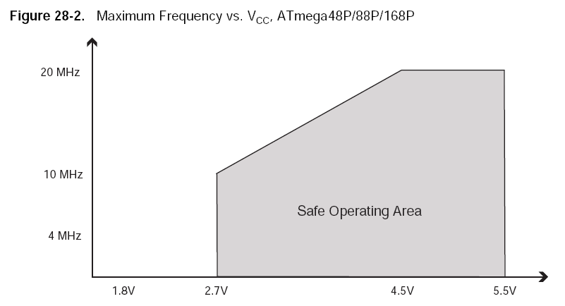 使用する電源電圧に応じて、安全に稼働する周波数の範囲が変化します。詳しくは--- ATmega168P技術資料(PDF,英語)を見てください。